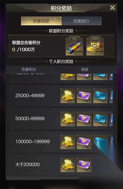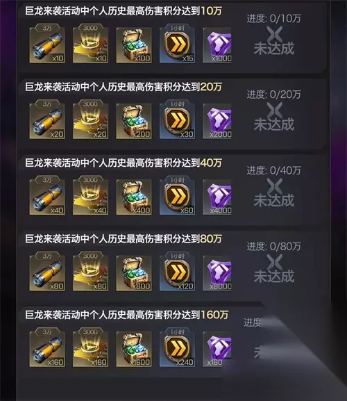当指挥官单次活动的历史最高伤害积分达到指定积分时,可在活动界面中领取积分成就奖励,具体奖励如下: