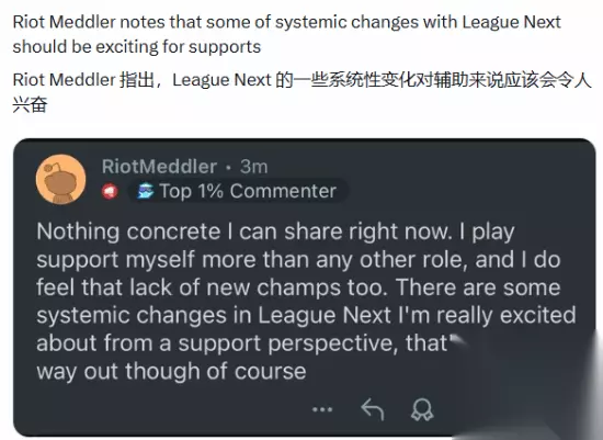 自2023年3月米利欧发布以来,Riot已陆续推出了九位新英雄(包括已确认但尚未发布的洛克),但没有一位是辅助,且今年Riot表示只会上线一个新英雄,这意味着到2027年,辅助位将面临长达四年的新英雄荒,甚至可能更久。 面对辅助玩家的不满,Riot高级副总裁Andrei “Meddler” van Roon在Reddit上回应:“我现在不能透露具体内容。我自己玩得最多的就是辅助位,我也同样感受到缺乏新英雄的困扰。” Meddler透露,辅助位的重大调整将在2027年的“League Next”更新中落地。他表示:“在‘League Next’中,有一些从辅助视角来看我非常期待的系统性改动,当然那还需要一段时间。”