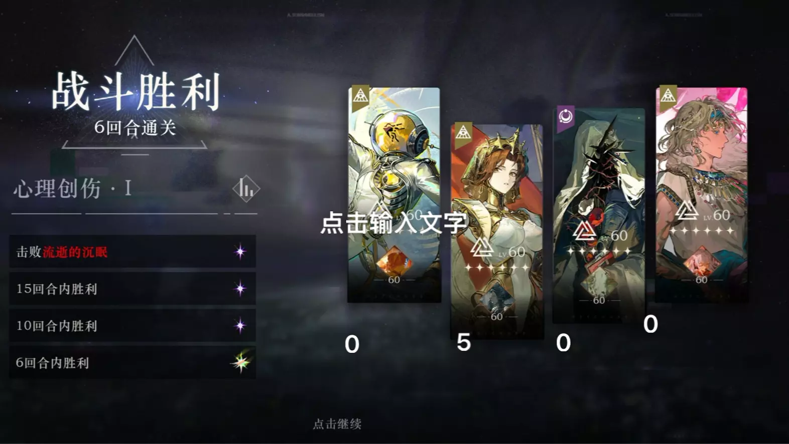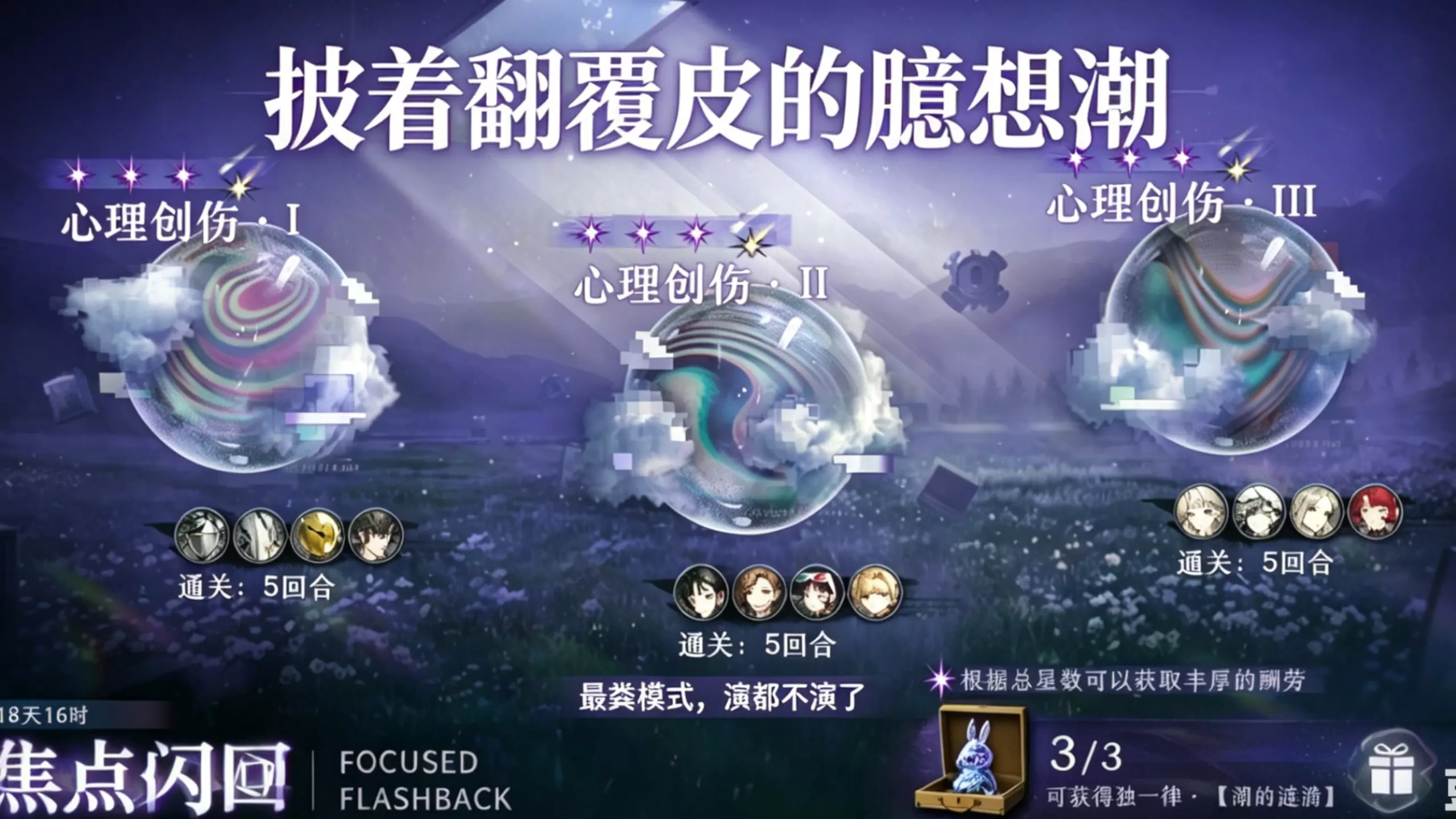 这是二次元手游《重返未来1999》的“焦点闪回”活动副本“心理创伤·Ⅲ”的满星通关内容,展示了战斗中的技能释放、伤害数值等通关过程画面。