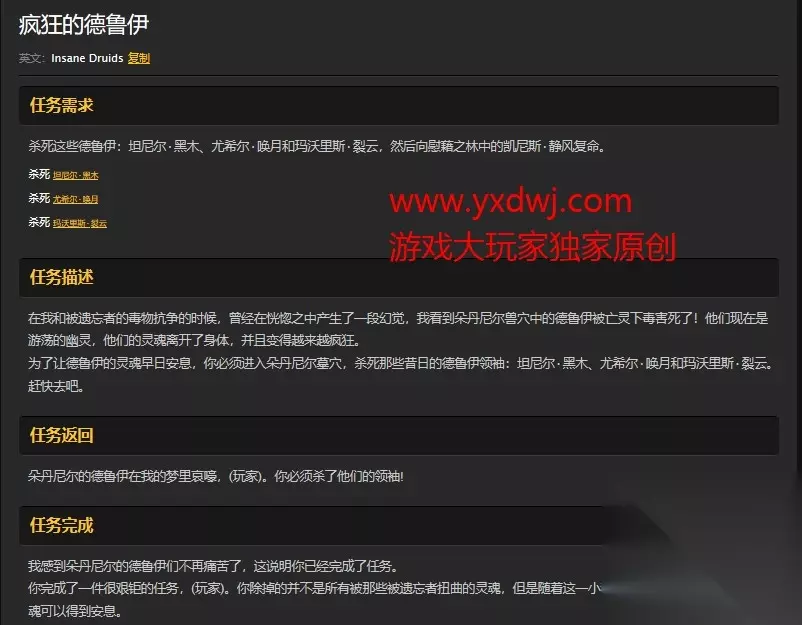 魔兽世界怀旧服疯狂的德鲁伊任务怎么做?WOW怀旧服坦尼尔·黑木,尤希尔·唤月,玛沃里斯·裂云在哪儿?玩家在找到了病菌之后,凯尼斯意识到朵丹尼尔的兽穴之中的德鲁伊们已经被亡灵们用毒药杀死了,现在他们的灵魂在曾经的地方痛苦地徘徊,你只能够前往让他们安息,不少玩家找不到这三个德鲁伊在哪儿,下面86就来告诉大家怎么找到它们,具体操作如下: 任务接取地点 联盟玩家可以在灰谷的林歌神殿接到这个任务。 凯尼斯·静风会给你发放这个任务。 这个任务是疯狂的德鲁伊系列任务的第三步也是最后一步。 下面是具体坐标: