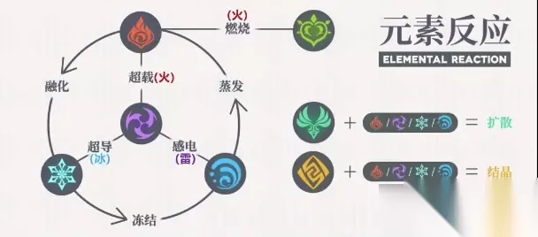4、火×风 ①元素反应:扩散 ②元素增幅:火元素伤害,剧变反应 5、火×草 ①元素反应:燃烧 ②元素增幅:火元素伤害,剧变反应 6、火×岩 ①元素反应:结晶 ②元素增幅:无伤害,生成护盾,惰性剧变反应 二、水元素 1、水×火 ①元素反应:蒸发 ②元素增幅:2.0,增幅反应 2、水×冰 ①元素反应:冻结 ②元素增幅:无伤害,冻住敌人,惰性反应*((水×冰)×物理)碎冰 3、水×雷 ①元素反应:感电 ②元素增幅:雷元素伤害,剧变反应