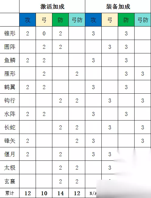 从上表可以看出,全部阵形激活,可以全系兵装提升10+,但这里要说明的是阵形激活后的兵装可以累计,但是“装配”里的兵装属性增加,只有游戏内英雄所使用的阵形与阵法装配的阵型一致,才能享受兵装数据的加成。简单的说,阵法“激活”是只需要激活,本武将就可以享受数值,而“装配”是只有在游戏内使用该阵形才享受。还有一点就是每个武将激活的阵型是不通用的,需要每个单独激活哦!