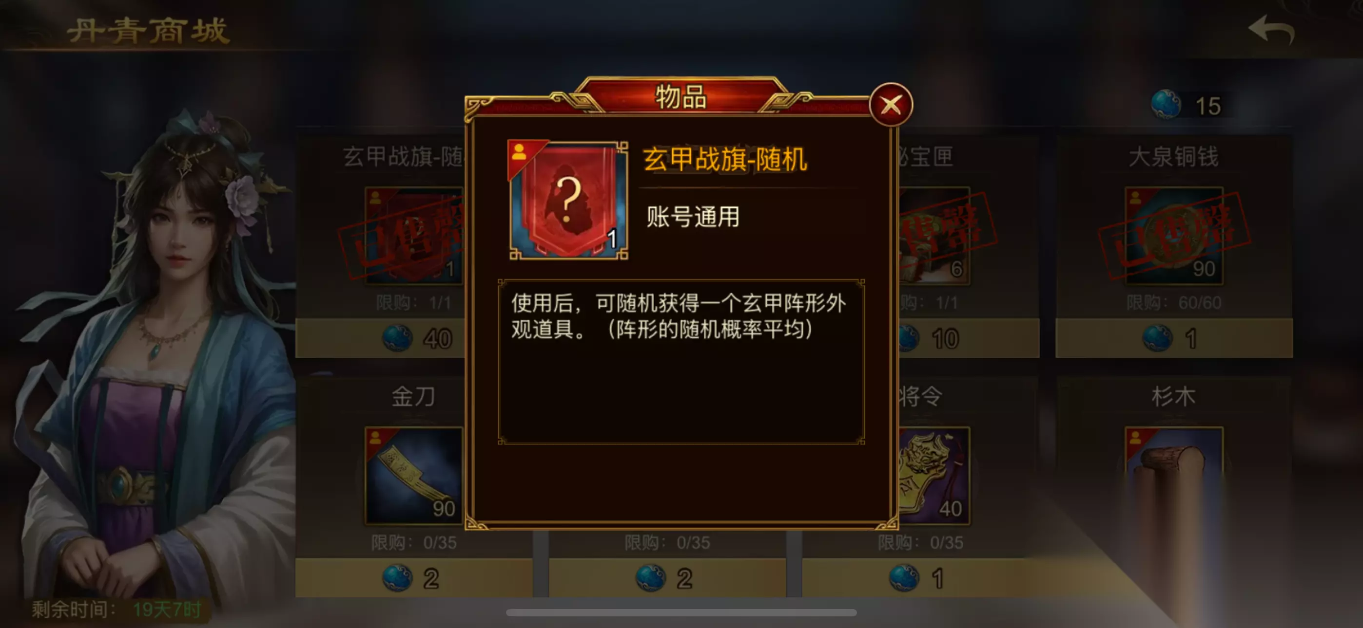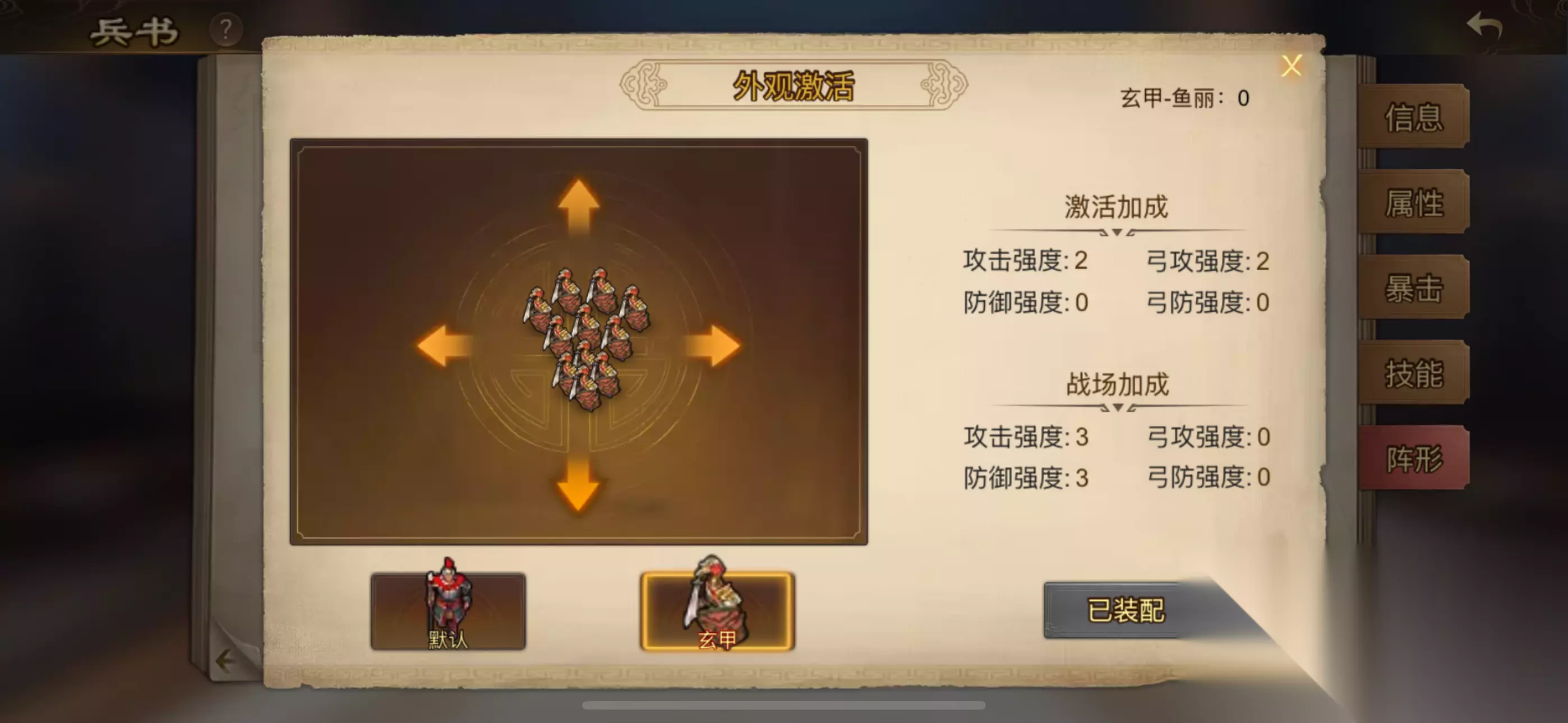 还有一点在这里提醒一下大家,获得玄甲战旗-随机(或自选),大家一定要想好给谁,不要一时脑热,因为玄甲战旗额外增加兵装的,虽然加的不多,但你不要小看了这一点兵装,如果一个武将能激活全部阵形,那兵装也是不小的提升,不信?请看下图