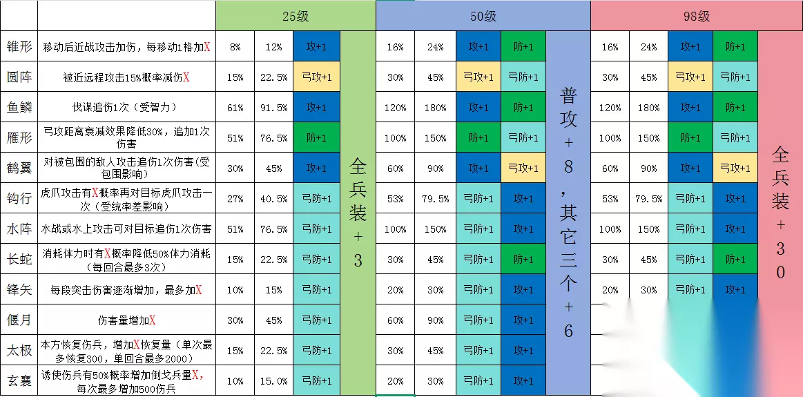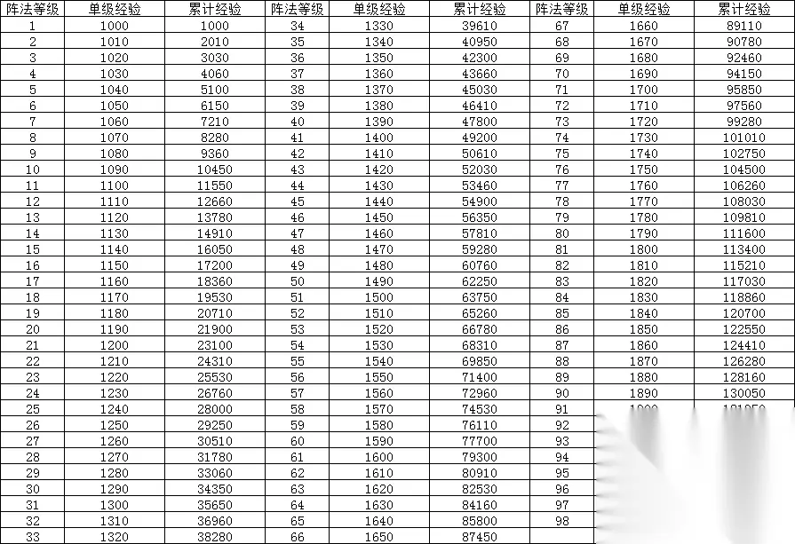 新的“阵法”系统,主要还是从阵形相关方面做了加强。尤其是首次加入了阵形的普攻、普防、弓攻、弓防适应阶的等级提升,上图已经用颜色标注了相关适应阶提升的不同属性,方便大家观摩。阵法提升到25级固定增加一个适应阶,50级固定增加第二个适应阶,这里要提示大家一点的是25级、50级、98级所显示的是最终获得的属性提升,相互之间是不累计的,例如锥形阵显示98级提升普攻适应阶+1、普防适应阶+1,其实普攻适应阶+1已经在25级时已经增加完毕,而普防适应阶+1已经在50级时已经增加完毕,那大家从表中可以看出,从50级提升到98级,仅额外增加了全兵装+24这一属性,其它相关属性没有提升。 阵法提升主要依赖于新的资源“竹简”,竹简主要获得的方法有累充、完成任务、重复碎片的回收、商店兑换等方式。每个竹简大概平均能获得100点经验,而每1级需要的经验值,计算方式应该是=1000+(N-1)*10,其中1000经验是常数值,N代表你当下即将升到的等级,例如35级,按上述方式你需要1000+(35-1)*10=1340点经验。目前高段玩家主流推荐的是张郃偃月阵加强,因为从获益角度来说,张郃的伤害是短平快的,可以看下图
