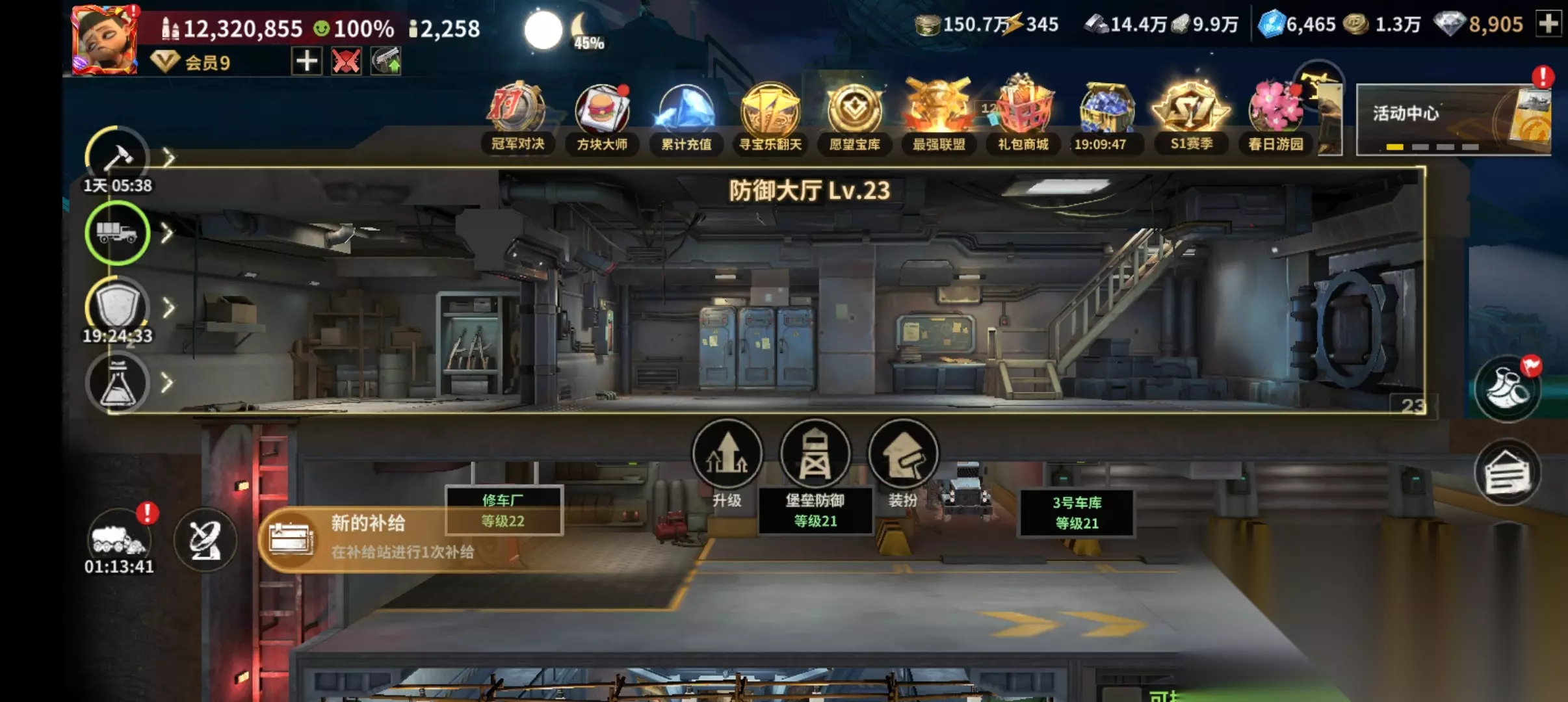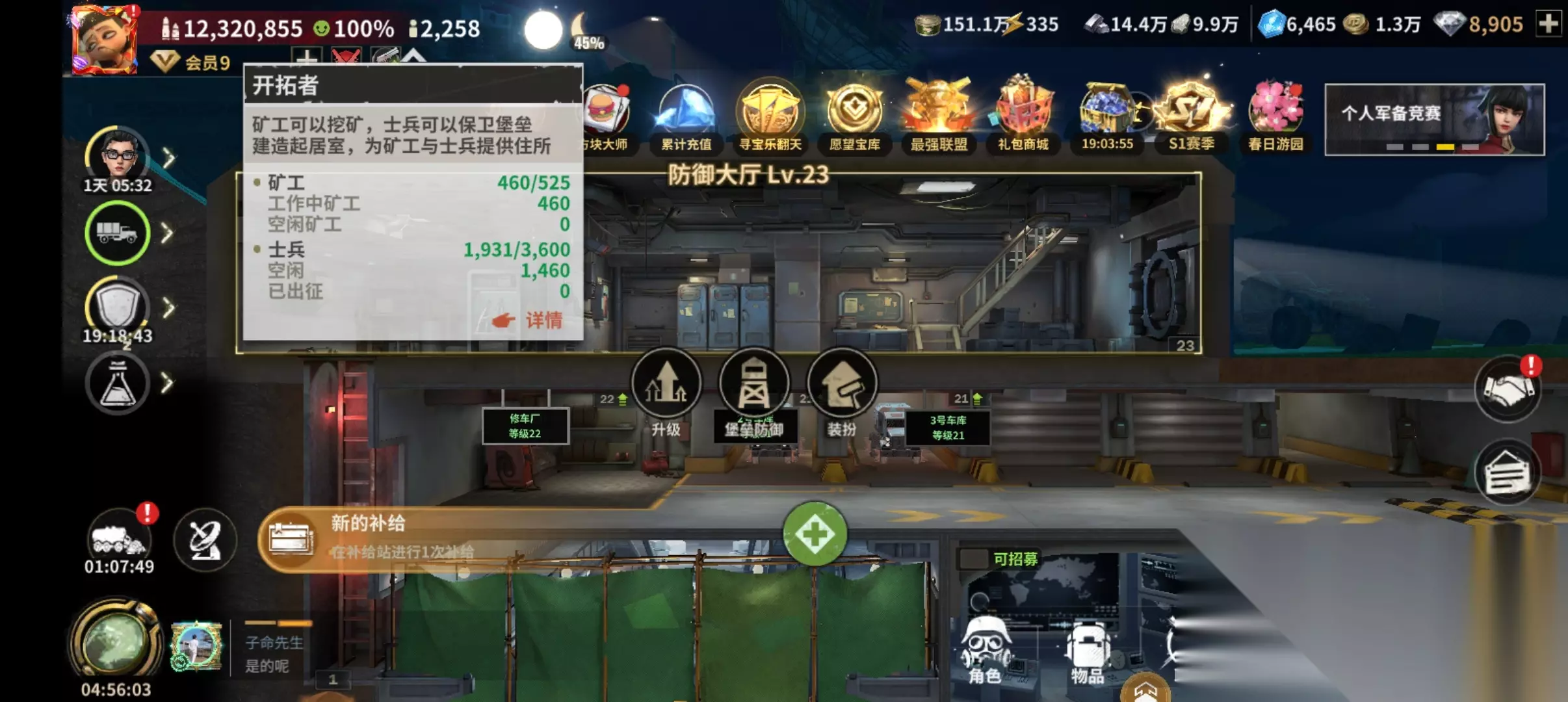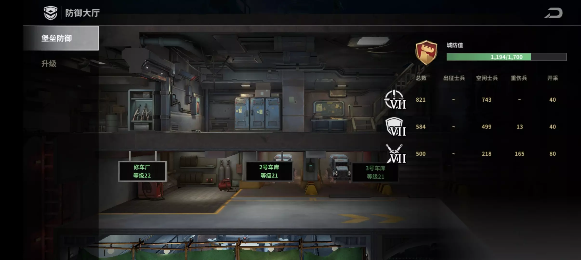 就能看到你目前士兵和矿工数量以及上限了,然后可以点击详情或者找到防御大厅: