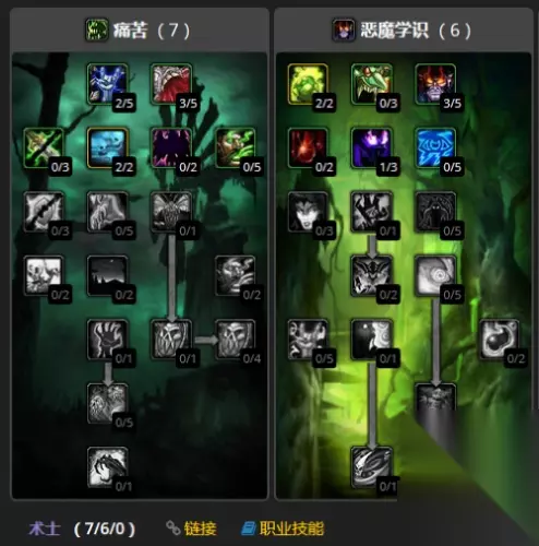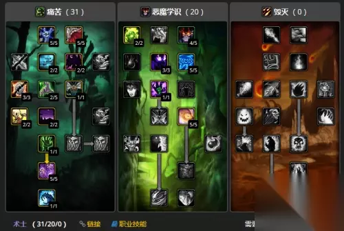 练级天赋 除了毁灭都能练,而且也许你不信,『主痛苦+辅助恶魔』天赋练级最舒服。 原因是痛苦术可以秒发腐蚀术和生命虹吸。 22级的时候要洗一次天赋,因为前期进痛苦线会让你宝宝威胁值跟不上,降低你的输出效率。 属性:法强>精神>智力>耐力 至21级 强化腐蚀术3点,镇压2点,强化吸取灵魂2点,强化腐蚀术点满,镇压点满,最后到22级洗出强化虚空行者。 22级洗成这样