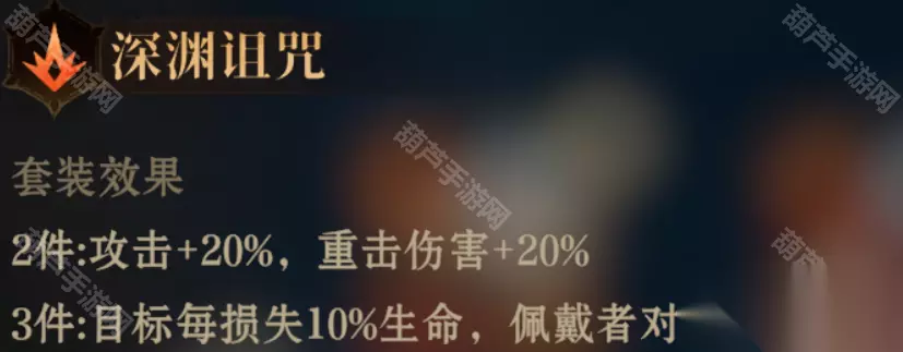 2件:攻击+20%,精通+30 3件:佩戴者造成精通伤害提升20%。 推荐使用:S2没什么精通伤害的英雄,可能用不上 ③深渊诅咒