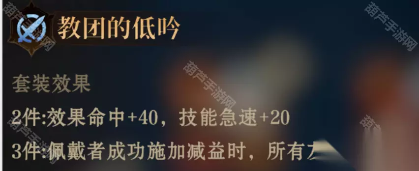 2件:效果命中+40,效果抵抗+60 3件:佩戴者受到伤害时,有50%概率对伤害来源施加冰冻,持续3秒 推荐使用:冰系坦克的春天 ⑥教团的低吟