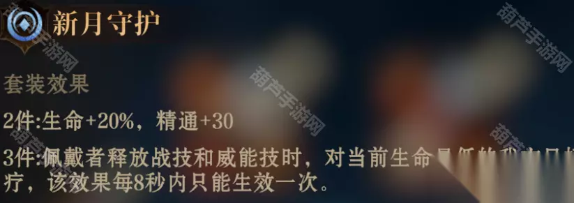 2件:效果命中+40,技能急速+20 3件:佩戴者成功施加减益时,所有友方造成伤害提升10%,持续10秒 推荐使用:减益辅助必备了啊 ⑦新月守护