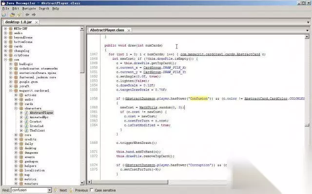 第二步 用 java decompiler 打开jar包(名字有点像,但是另一个工具),分别定位到这3个文件,搜索confusion找到代码,然后观察代码。 你只需要稍微有一点点英文基础,就能看到关键代码在 AbstractPlayer.class这里,random(0,3)就是随机返回0-3。这个代码属于 public void draw(int numCards)