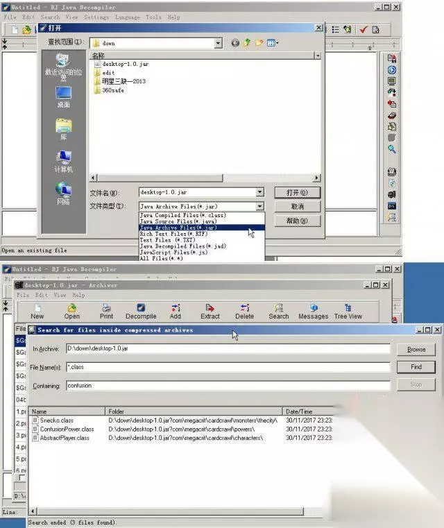 今天 233乐园和大家讲解杀戮尖塔修改class文件图文教程 杀戮尖塔中玩家们可以单独来修改class文件,来在游戏中得到想要的状态。下面给大家带来杀戮尖塔修改class文件图文教程,感兴趣的玩家可以试一下。 从网上看到有两种修改方法。一种是用某些工具把整个jar包完全反编译,然后就像制作游戏一样修改代码后再重新打包。另一种是修改单独的class文件。 理论上说第一种是最好的,因为可以想怎么改就怎么改,但仔细想想,那不等于自学java一样么,我们只想简单改改游戏,并不想搞的那么复杂不是。 所以我研究的是第二种,测试成功。现在说说具体步骤。 比如游戏里会中一个confusion”混乱“负面状态,卡牌消耗是0-3随机的。要随时有这个状态,并总能随到0多好,就要这个!(其实有时候切换为英文版更方便看到关键词) 第一步 用 DJ java decomper 打开jar233乐园,在弹出的窗口上选择 search,文件类型*.class,搜索文本“confusion”。 等一会找到3个文件包含这个词。