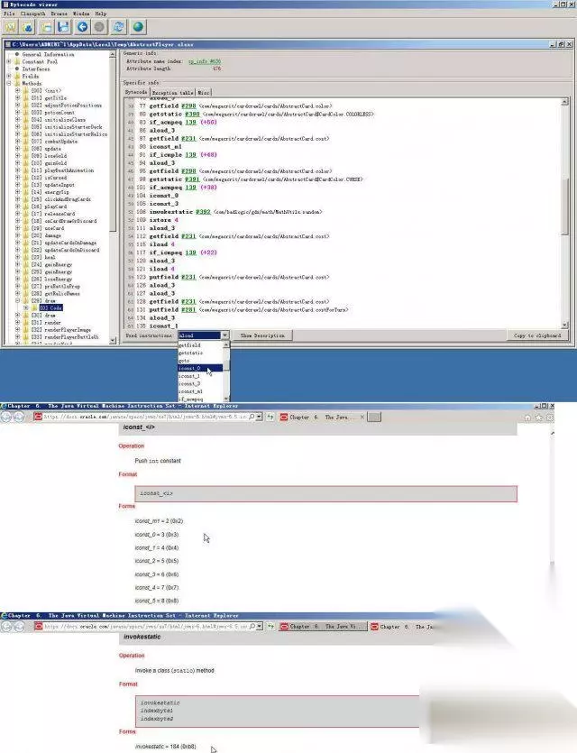 第三步 很遗憾,虽然已经看到了要改的代码,但并不能在这里把3改成0。因为class文件实际是难以理解的jvm代码,刚才只是工具帮你转换为容易理解的明文代码而已。 用winrar打开jar包,把AbstractPlayer.class解压出来。用jclasslib bytecode viewer打开。(安装这个工具前还要先装一个java runtime,java官网下载) 在Methods里面可以看到有两个draw,点击Code就能看到jvm机器码了。一对比很容易确定第一个是我们找的。 关键是把iconst_3改成iconst_0。接下来就是提取这段机器码。 在最下面找到iconst_0,点那个showDescription,可以弹出一个网页显示出这个命令的机器码是 3 iconst_3 是6 invokestatic 是b8 ,后面还有2bit的参数,#392转换为16进制是0x188,那么这里的jvm代码就是 b8 01 88 这两个命令的jvm代码连起来就是 03 06 b8 01 88 。