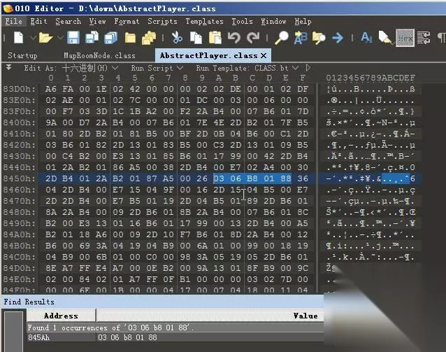 最后一步 用十六进制编辑器打开AbstractPlayer.class。(这种软件比较多,010editro,winhex等等随便都可以),搜索 03 06 b8 01 88。然后改为 03 03 b8 01 88,保存。 把修改后的class文件覆盖回去,完成。