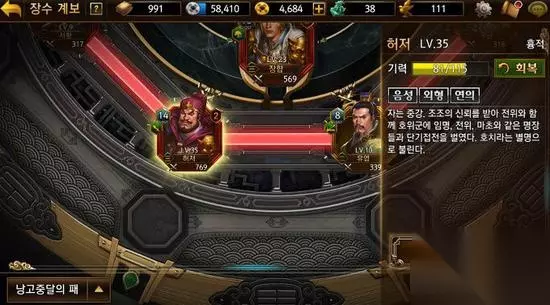 在游戏中负责补助技能英雄,而且目前韩国地区玩家认为补助英雄当中S级英雄。一开始的时候战场难度不是很高。但是,到30级以上的话,游戏难度变高了。至少养成一个以上补助技能英雄,战场战斗持续性和稳定性。特别是25级能学《大福结》是战场上非常有用,而且,可以恢复技能不用花时间,恢复药。除了恢复功能以外 每个Buff技能也是挺有用。 3。典韦