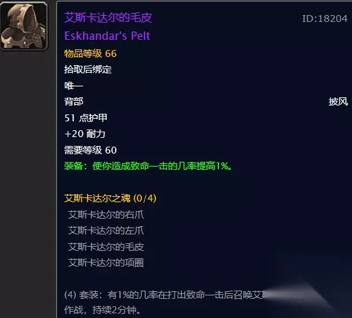 魔兽世界怀旧服艾斯卡达尔的毛皮在哪儿?WOW怀旧服套装之一艾斯卡达尔的毛皮怎么获取世界boss霸主卡扎克今天已经开放,有的玩家在游戏中会收集一套叫做艾斯卡达尔的套装,有的玩家不知道套装中的披风在哪里掉落,下面86来告诉大家怎么获取艾斯卡达尔的披风,具体操作如下: 装备属性 艾斯卡达尔的披风是装备等级66的皮甲腰带,需要60级才能装备。 拥有增加20耐力的高血量白字属性。 还增加了玩家1%的物理致命一击,这个装备适合熊德或者猫德来获取。