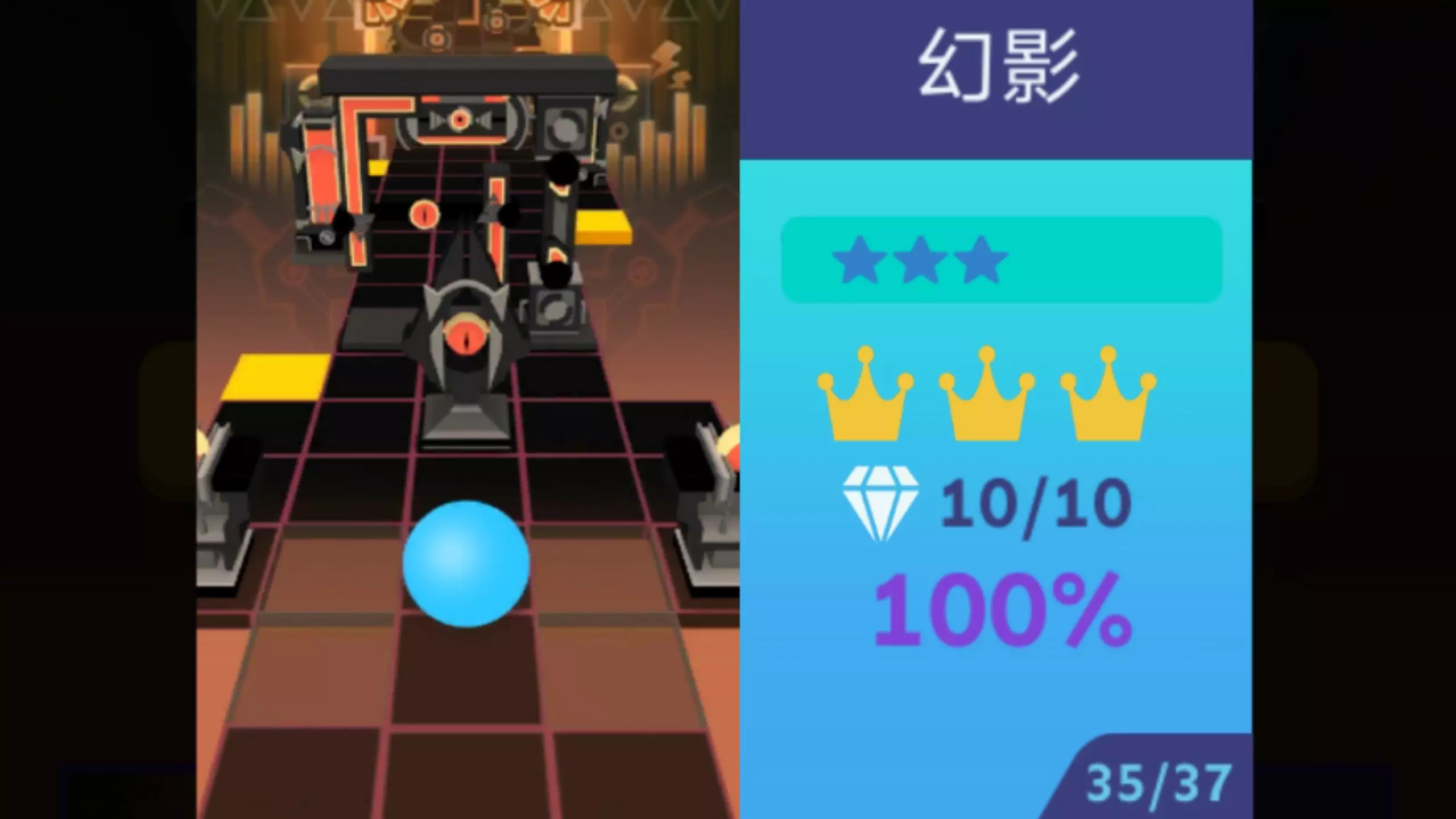 这是游戏《滚动的天空》的通关分享,展示了“周年庆”关卡的完美通关数据,包括100%进度、全钻石收集,还呈现了该关卡的游戏过程画面,同时露出了“重生”关卡的界面。
