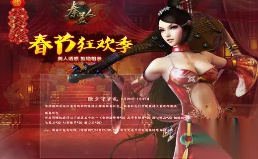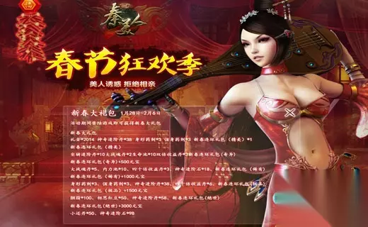 【新春大礼包】 时间:1月28日-2月6日23:59 内容:活动期间登陆游戏即可获得新春大礼包 此活动不仅可以免费获得新春大礼包,随后加些许元宝,即可获得新春连环礼包(精美)、新春连环礼包(奇异)、新春连环礼包(稀有)、新春连环礼包(极品)、新春连环礼包(绝世)等等。