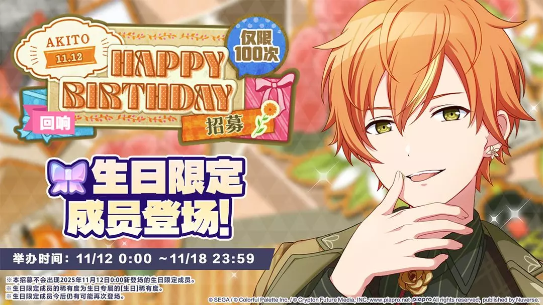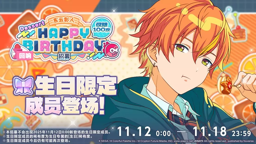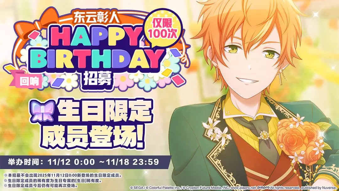 11/12 00:00起将举办「[东云彰人] HAPPY BIRTHDAY 2025招募」、「[回响][东云彰人] HAPPY BIRTHDAY Dessert招募」、「[回响][东云彰人] HAPPY BIRTHDAY Stamp招募」、「[回响][东云彰人] HAPPY BIRTHDAY Flower招募」🎉