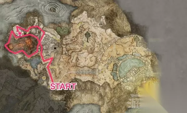 地图碎片-格密尔火山 格密尔火山的地图碎片路线比较复杂,需要绕很多路,并且途中会经过许多BOSS的位置,跑酷的话要提前注意BOSS位置尽量躲避攻击。 (下图粉色路线为行进路线,星标位置为地图碎片位置,最下方为起点)