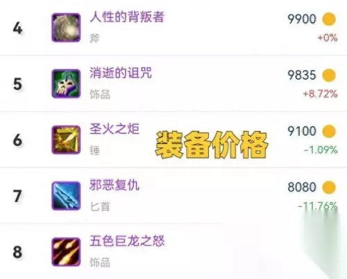 除了上述3件装备的均价是超过1W金币,从第四名开始就不足1W金币了。无论是226等级的双手锤,还是226等级的治疗武器,价格都在9000金币这个级别。