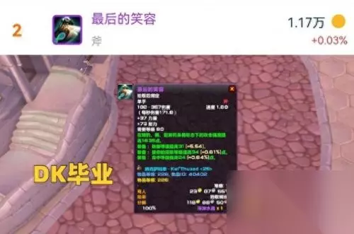 排名第二的是单手斧最后的笑容,价格为1.17W金币。虽然这把武器的绿字属性更加偏向防御,但是这把武器是邪DK在P1阶段的毕业武器,而邪DK在25人本中的数量又比较多,价格自然也就被顶了上去。