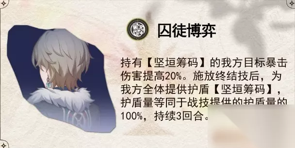 这个星魂分为两个部分,首先给砂金提供了额外的输出型辅助能力,全队拥有【坚垣筹码】的角色都可以获得暴击伤害提升。此外砂金的终结技也可以施加【坚垣筹码】了,数值和机制都与战技相同,配合追加攻击给的护盾基本上非高压环境可以不使用战技了。 星魂2:有限理性