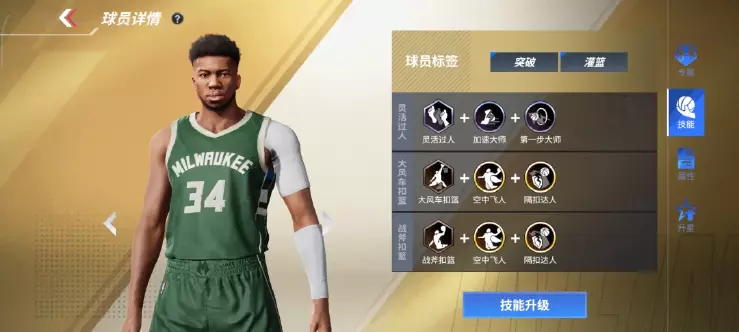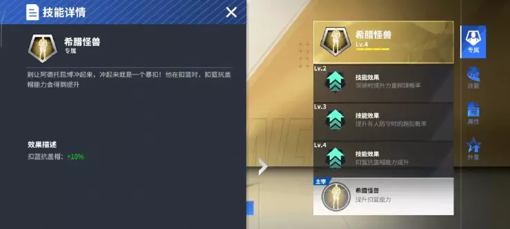 ● 4级专属:扣篮抗盖帽增加10%,强势的过人,致命的突破,犀利的起扣,最后到了完美的终结,抗盖帽属性大幅提升,搭配字母高额的扣篮属性,高概率的起扣和专属欧洲步,多重属性融为一体,这一球,我一定能扣进去!