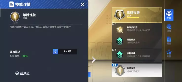 ●阿德托昆博主宰:希腊怪兽!最强神话来自希腊!所向皆破,势不可挡!直接提升自身扣篮属性10%,朴实无华的加成带来的是势不可挡的气魄,超高加成破千属性,扣篮再无人可挡!