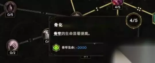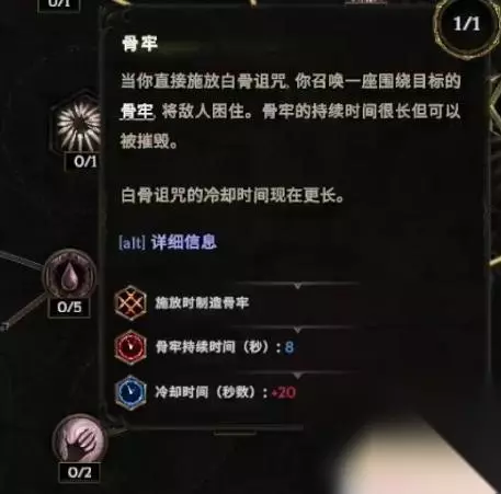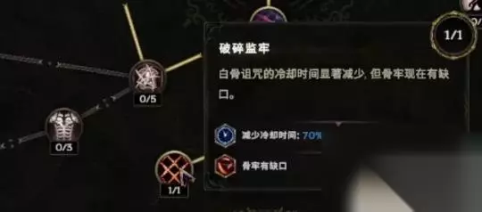 一个叫白骨诅咒,白骨诅咒这个技能我们之前会点一些别的节点。比如说白骨诅咒降低敌人护甲,跟给自己护甲两个节点,但现在我们不点它了,我们现在点骨化、骨牢、破碎监牢。 这三个技能点完了之后,白骨诅咒就会额外的扔一个骨牢出来了,扔的这个骨牢它本身有一个基础生命值。然后跟暗黑4一样,我们的骨牢也是召唤物,这时候我们再用亵渎帷幕把它们吃了,就会拥有一个比较高的护盾。