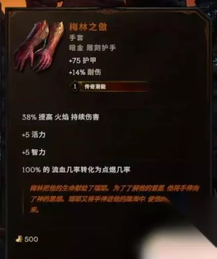 再说一个额外的变种,就是梅林之傲手套配合精神瘟疫的变种。 说一下这两个技能之间怎么联动,就是我们的献祭者的祭品,它是根据点燃层处来获得增伤,然后这个点燃本身是会对我们造成伤害的。之前的玩法我们盾没有那么多,所以是不带梅林之傲的。 梅林之傲可以有一个非常变态的点燃陈数,让我们有个40、50,甚至60层的点燃层数。然后配合腰带能够给我们最多240的点伤。