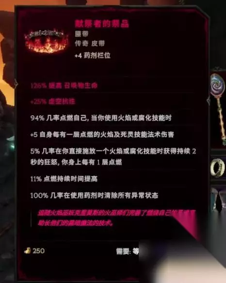 然后是勺子,勺子这个道具是一定要配合献祭者的祭品来使用。献血者的祭品是打魂火堡垒难度三以上的巫妖会掉的。勺子是我们去刷流亡法师有概率掉的。勺子跟迷失之魂是同样的,你必须要打上暴击他才能用。 勺子为什么要配合献祭者的祭品来用的呢?很简单,我们带勺子很亏点伤,你可以看到勺子的基础点伤只有14点,而我们正常的亵渎魔杖可能有5、60点。 所以我们亏的点伤要从我们的腰带来找。腰带的效果是当我们用火焰或者腐发法术的时候,有概率点燃自己。点燃自己之后我们就能获得点伤,