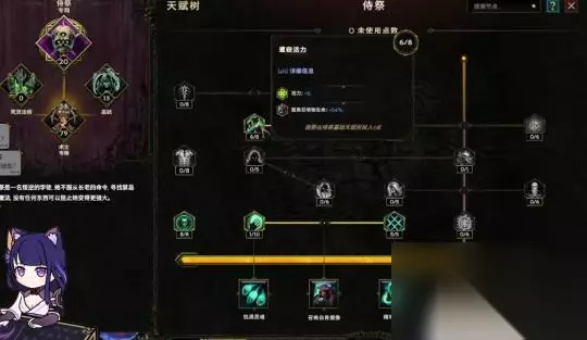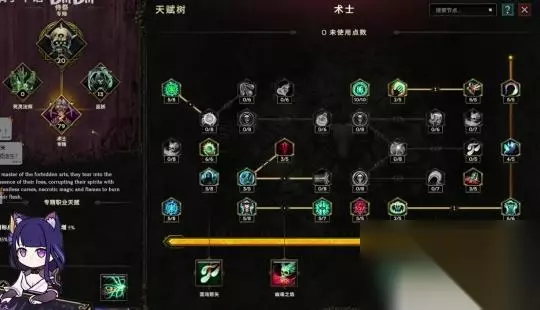 然后再说一下天赋啊,天赋就是这样,还是侍祭这里二十点。术士这里的没什么改变,乌妖这边的话就是拿智力,还有拿我们的冷酷幸存者。这个法术伤害偷取生命,如果你带了龙心的话是非常必要的。