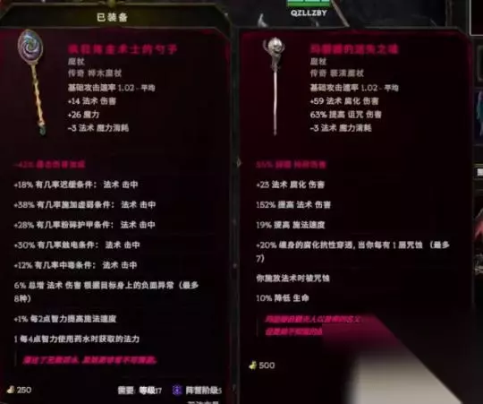 在这种情况之下,我们可以换两种暗金的武器,一种是勺子,另外一种是玛丽娜的迷失之魂。 玛丽娜的迷失之魂就是一个传奇级别的亵渎魔杖,它会有一些更高的法术点伤跟增伤,还会加我们的施法速度,还能在释放法术的时候咒蚀我们。