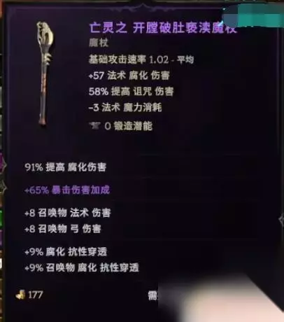 整体的技能说完了我们说一下装备的组合。装备组合这里其实有比较多的变种,一种是我们前期会拿的魔杖,前期拿的魔杖大概就是这样的一个法术腐化伤害加诅咒伤害的亵渎魔杖的基底。 词缀就是像我这样前面是有一个腐化伤害也好、法术伤害也好的A伤, 最重要的是有一个暴伤加成。然后是腐化抗性穿透,有这三条词条就好了。