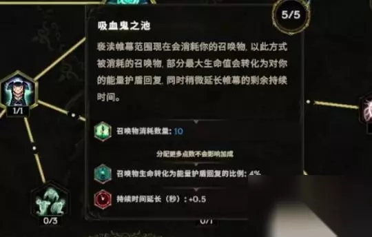 因为亵渎帷幕,你点到左下角这里吸血鬼支持。它会提示我们亵渎帷幕现在的范围会消耗你的召唤物。用这个方式被消耗的召唤物,它的一部分最大生命会转化为对我们的能量护盾维护,就是这样的一个简单的机制。 这两天我看了一下2神的帖子,他说这个护盾的转比例可能有问题,可能不是4%,而是40%,所以这个各位要不要用就自己看。 但总之,如果你用这一个流派的话,你能获得非常非常多的盾。你只要操控你的亵渎帷幕去吃这个周围的骨牢,就能获得很厚的护盾。 我们再回复之前另外一个问题,就是很多朋友之前会说我们玩这个冥府裂缝为什么不去点这个混沌破裂的节点?点了混沌破裂。然后我们再去点一个混沌箭矢,混沌箭矢有个节点来触发血液剥离。他觉得这样伤害很高,因为输出是很多维度的。