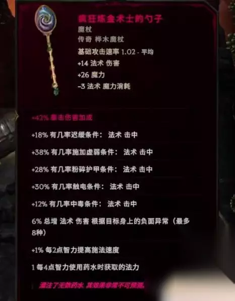 点伤补完了之后,我们就可以用勺子了,勺子的效果可能有点抽象,但是我们主要要的就是它下面三条。 一个是根据目标身上的负面异常增伤,最高分之48,这是个独立增伤。第二个就是智力提高施法。第三个就是使用药水的时候回蓝。