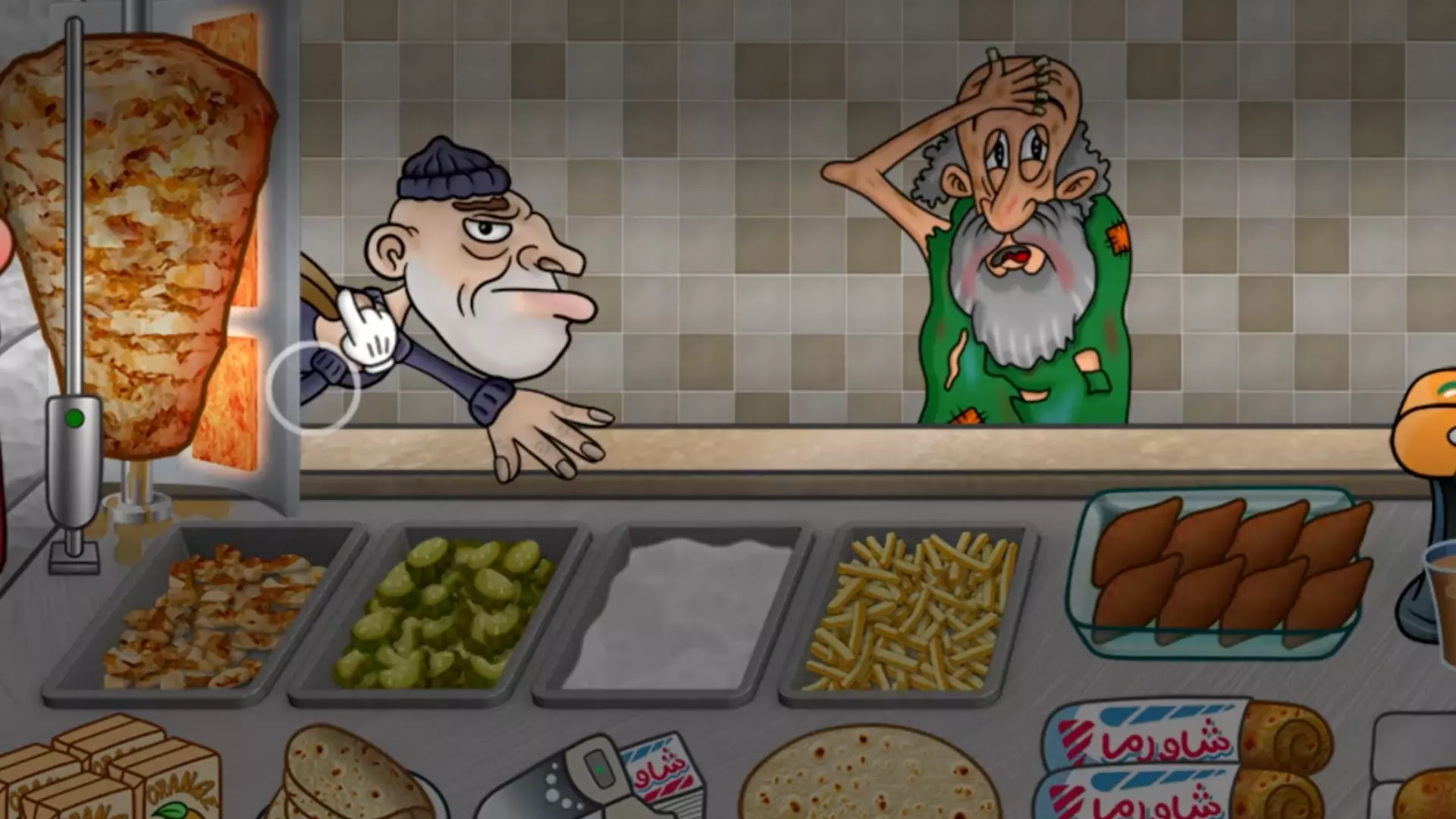 这是游戏《沙威玛传奇》的相关内容,展示了乞丐偷秘方开法拉费尔之王餐厅的趣味剧情,还有制作玛莎拉卷饼等餐食、应对顾客需求的游戏玩法,魔性的风格颇具特色。
