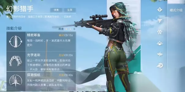 幻影猎手技能介绍 【被动技能:精密筹备】 每隔一段时间,枪械下一发子弹开火伤害提升。 【主动技能:光学迷彩】 披上一件光学迷彩吉利服,在该状态下移速增加,并降低自身发出的声音。但当职业角色开火射击之后,便会解除吉利服状态。 【终极技能:探测信标】 发射一枚声呐探测信标,间歇地标记范围内敌人位置,且队友可见。 以上为大家详细的介绍了《和平精英》幻影猎手玩法攻略的完成攻略,这款游戏中,新活动新玩法也是蛮多的,新的体验但也有新的问题,233乐园是专业的游戏攻略平台,这款游戏最详细的攻略带给大家,帮你更好的体验游戏内容。
