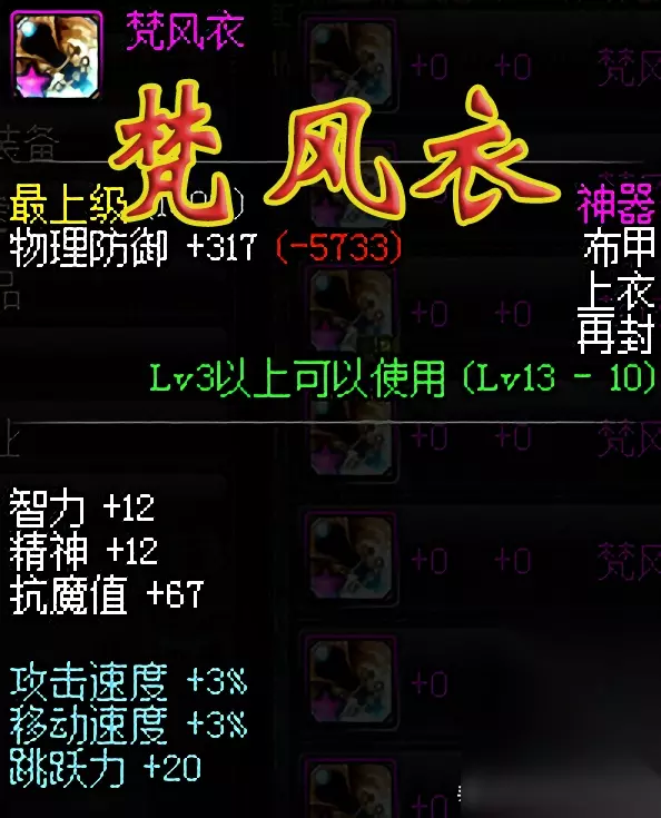 梵风衣 对于很多60版本之后才入坑的玩家们来说,可能理解不了梵风衣的价格为何如此高,增加3%的攻击速度和3%的移动速度,在如今这个版本完全可以理解为是没有属性,但是在60版本,尤其是在当时的PK场,这可是真正的神器装备。相比于当年的其他PK场装备,梵风衣的属性是完全地秒杀它们。