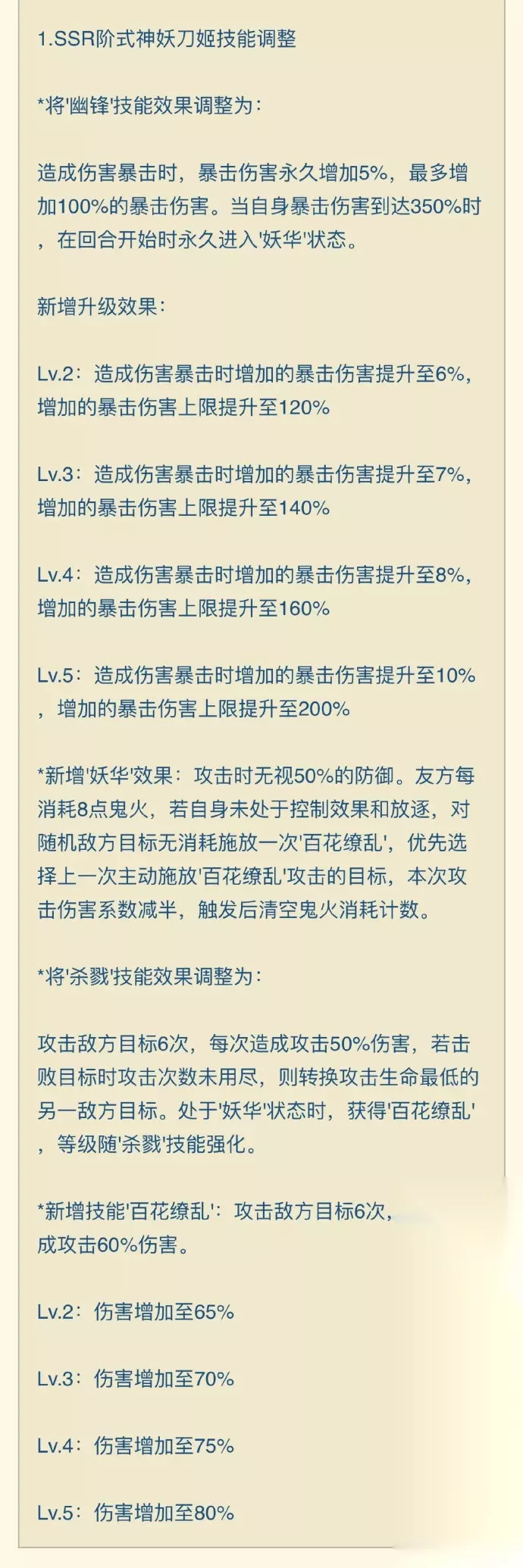 《阴阳师》新版妖刀姬技能强度解析 1.技能方面: 普攻不变;被动一个大招+爆伤60%,最高有200%的爆伤加成,总爆伤达到350%就可以进“妖华”状态(忽视50%防御,友方消耗8火白嫖一个240%系数的单体伤害技能);“妖华”状态大招系数从348%→480%,但是没有击杀+次数的效果了。 2.理想就业场景为pve单体,1-2次大招开状态(注意,不一定是1次大招开状态最好,因为自带高额爆伤的式神面板带攻击收益或许更高,所以不一定强求290+爆伤) 因为自带破防和爆伤加成,新版妖刀姬应该是当前版本土蜘蛛御魂的最优选择; 3. vs紧那罗: 1)紧那罗最终形态大招系数为900%,妖刀姬需要用白嫖大招,破防加成,紧那罗暖机时间的输出去弥补这部分差距; 2)紧那罗具有辅助效果,回血/加防/打火/驱散/加爆伤。注意拉条不一定是优势,因为会影响土蜘蛛炸伤害(逢魔打的多的朋友们应该都懂),妖刀姬纯输出; 3)逢魔真假阶段,妖刀姬可以对真怪稳定输出,而紧那罗会浪费一部分伤害。 4)防御高的单体场合,妖刀姬一定会比紧那罗表现得更出色。比如超鬼王或者以后新的高防御单体本,妖刀姬都有很大的开发空间。 4.需要测试并且比较重要的几个点: 1)百花缭乱的动画速度; 2)和sp辉夜姬的相性,白嫖大招是否计算愿力消耗。当然不一定搭配sp辉夜,配合千姬概率更大; 3)破防的输出波动空间,特别是配合蝎女等式神的情况下。 5.总的来说,目前版本的妖刀姬改动感觉是ch动了脑子做的,很有和紧那罗扳一扳手腕的可能性,也很有可能会引起逢魔之时阵容的洗牌(还好我还没来得及更新逢魔阵容,幸好幸好)。但具体怎么样,还是要看实测,也要看最终活到正式服的是哪个版本,大家可以再观望下~