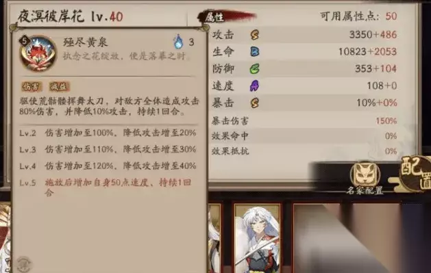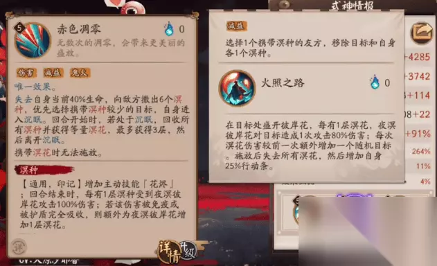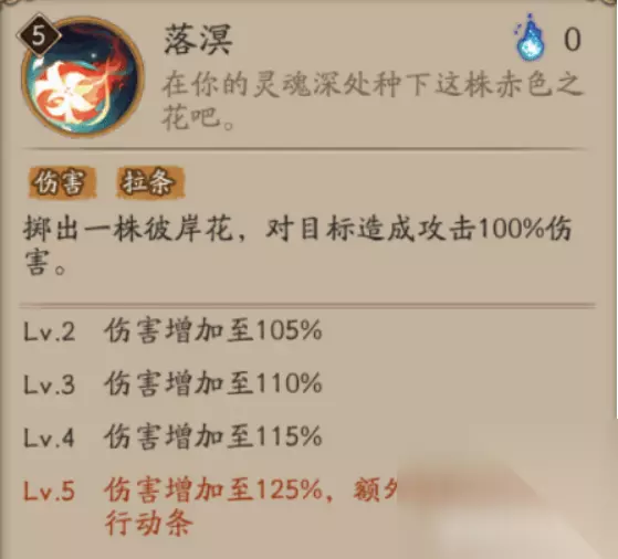 sp彼岸花技能效果介绍: 一技能(落溟): 是一个单纯的普攻技能(式神可以抛出一个彼岸花,能够对敌人造成物理攻击100%的伤害) 这个技能随着升级而变化 升到2级时,伤害增加至105% 当升级到3级时,伤害增加至110% 升级到4级时,伤害增加至115% 当升满Lv5时,就可以解锁其普攻自拉条20%的效果,这个式神还是一位不可多得的行动条大师。 二技能(赤色凋零): 这个技能是彼岸花最核心的技能,也是最难懂的技能,此技能时伤害,减伤,免火于一体的技能。 LV2,可以达到3层被动,并且每次离开沉睡后,都会永远的增加10%的攻击。 LV3化烬将会增加可以消耗的鬼火3个。 很重要的被动效果即失去自身的40%的血量,释放三个溟种(在这里介绍一下溟种:通用,印记,增加主动技能花烬,回合结束时,每有1层溟种受到夜溟彼岸花攻击100%伤害,若该伤害被免疫或被护盾全部吸收,且额外增加1层溟种,并且最多只能存10个溟种。),在开始回合的时候,如果处于沉眠,将会收回所有溟种并获得等量溟花。(溟花:增益,印记,获得时恢复每层自身生命上10%;携带溟花时,攻击后释放火照之路。) 三技能:具有伤害和减益效果,这个技能可以使荒骷髅挥动自身的太刀,并能够对全体敌方造成相对攻击80%的伤害,同时能够降低敌方百分之十的攻击,战斗时间长达一个回合。 此技能随着升级而改变。 升级到2时,对敌人的伤害再次增强20点,达到100%,同样降低敌人的攻击一个点达到降低攻击20% 升到3级时,增加伤害为110%,降低伤害30% 升到4级时,增加伤害120%,降低攻击40% 当升级到5级时,就会有物质的变化,施法效果后将增加自身50点速度,并且这个效果可以持续整整一个回合,这个技能很非常的强!