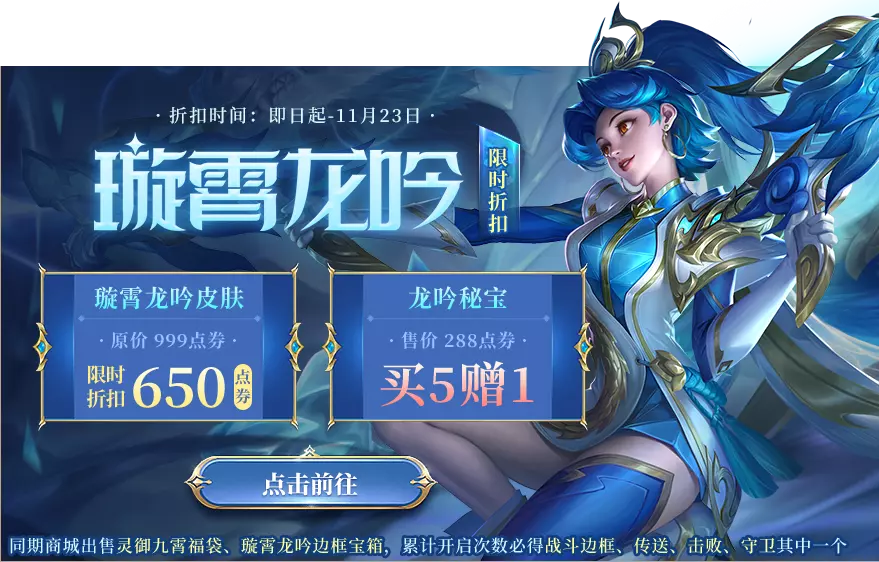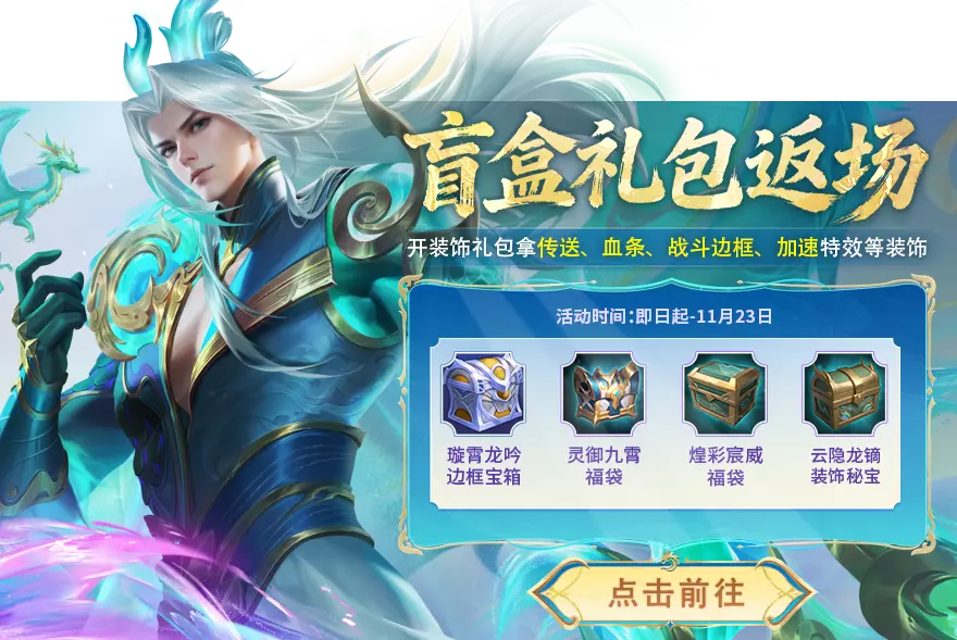 活动期间璇霄龙吟边框宝箱、灵御九霄福袋、煌彩宸威福袋、云隐龙镝秘宝限时返场~