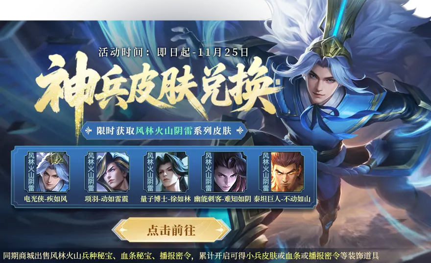 风林火山阴雷套系皮肤返场开启!通过每日登录等方式获取神兵兑换币可以限时获取幽能刺客-难知如阴、量子博士-徐如林、项羽-动如雷震、电光侠-疾如风、泰坦巨人-不动如山等稀有皮肤哦!