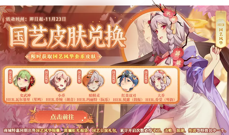 国艺皮肤兑换开启!限时兑换获取女武神-HER.瓦尔基里(笙鸣)、红炎双刃-HER.贝露(鼓振)、暗精灵-HER.玛丽特(阮乐)、大乔-HER.乔莹(琴韵)、小乔-HER.乔婉(胡音)等好礼!
