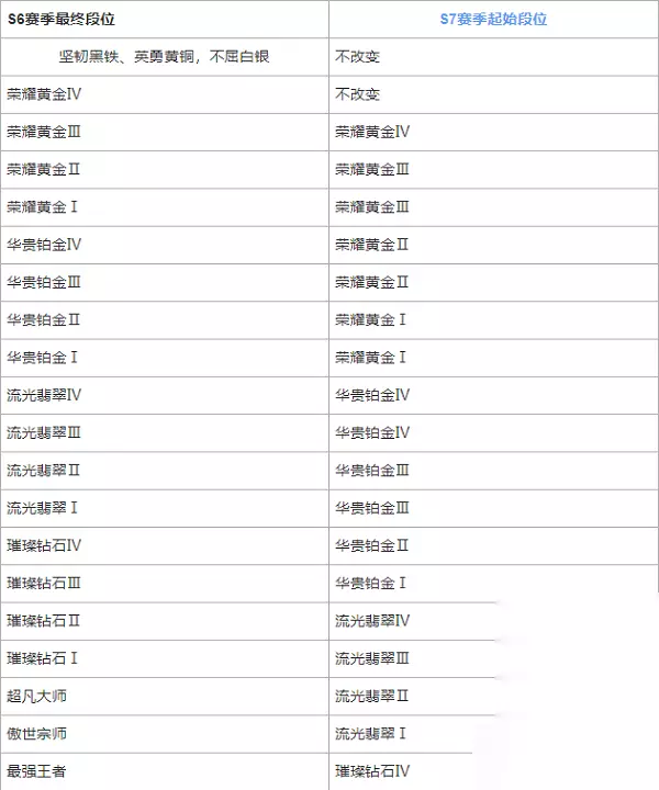 英雄联盟手游即将开启s7赛季,很多玩家都想要知道英雄联盟手游s7赛季段位继承是什么样的,下面小编就为大家带来了《英雄联盟手游》s7赛季段位继承表,感兴趣的小伙伴们一起来看看吧,希望能对大家有所帮助。 《英雄联盟手游》s7赛季段位继承表 1.对于在S6赛季已完成定位赛的玩家来说,新赛季的起始段位将取决于S6赛季所达到的最终段位,详情如下: