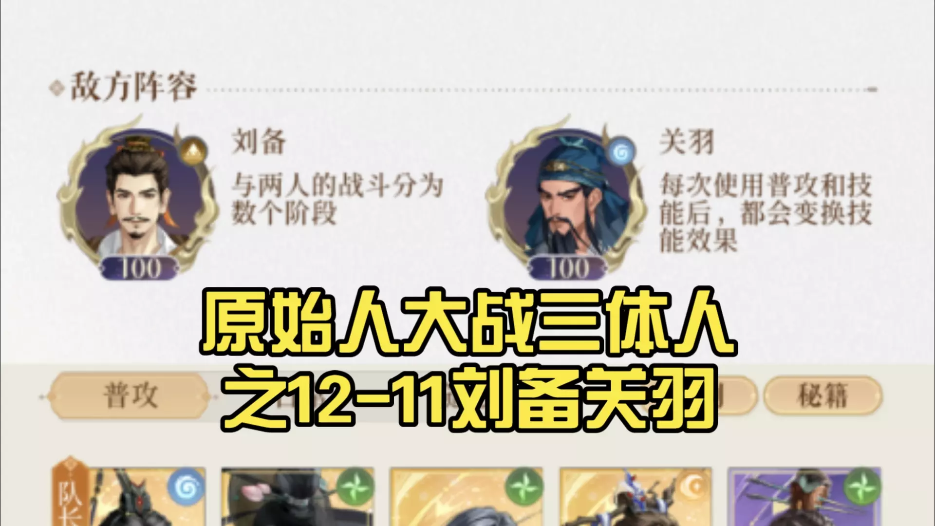 这是一篇《如鸢》主线十二章刘备关羽的中练度打法攻略,展示了对战刘备、关羽时的战斗画面与出战阵容,为中练度玩家提供该关卡的通关打法参考。