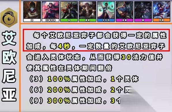 2、艾欧尼亚 效果:每个【艾欧尼亚】弈子都是各自战斗技艺的大师,因而会获得一定百分比的独特属性加成。(已列在他们的技能说明文本中),每过4秒,一定数量的【艾欧尼亚】弈子就会进入其灵体形态,从而获得30法力值并使其属性加成在持续期间翻倍。