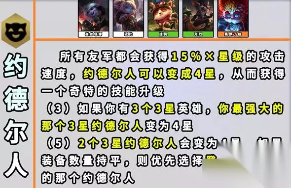 12、约德尔人 效果:所有友军获得15%x星级的攻击速度。【约德尔人】可以变成4星,从而获得一个奇特的技能升级。