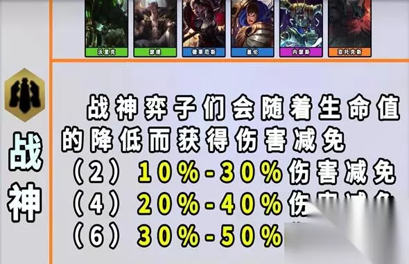 15、战神 效果:【战神】弈子们会随着生命值的降低而获得伤害减免。
