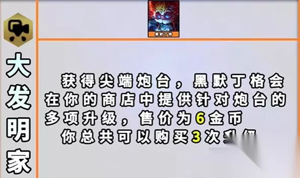 25、大发明家 效果:获得一个可用的【尖端炮台】。【黑默丁格】将在你的商店中提供针对【尖端炮台】的多项升级,售价为6金币。你总共可购买至多3次升级。
